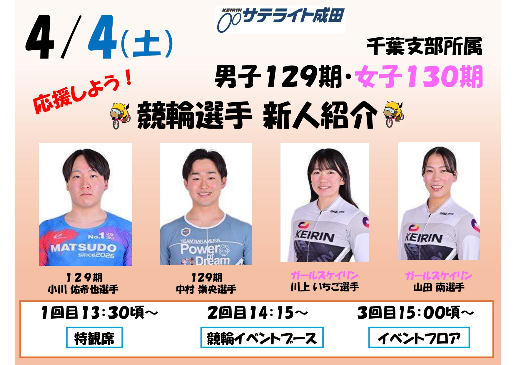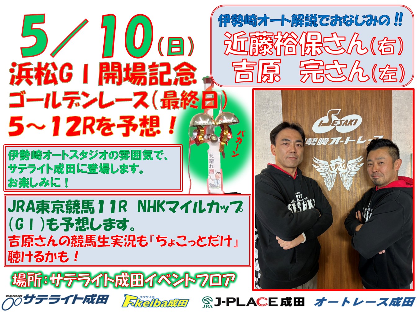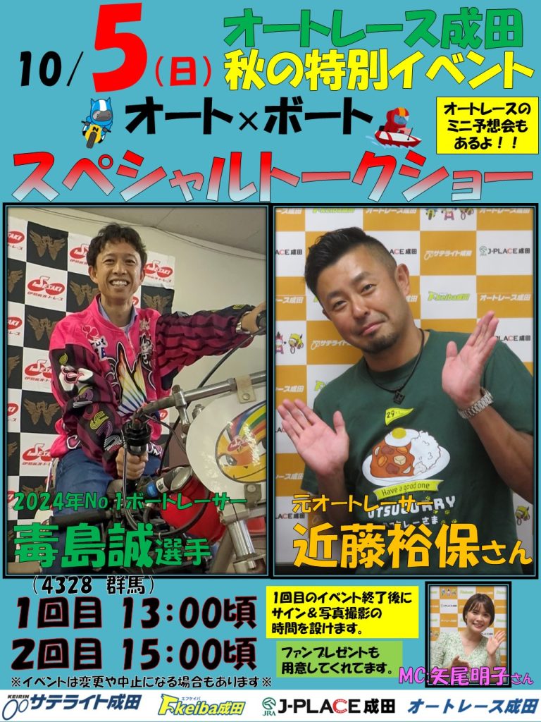 千葉県のサテライト成田・Fkeiba成田・J-PLACE成田・オートレース成田は、複合型場外発売施設です。J-PLACE成田はJRA日本中央競馬会、Fkeiba成田は地方競馬の馬券を販売。サテライト成田は競輪場外車券売場、オートレース成田はオートレースの場外車券売場となります。千葉県で馬券、車券を買うならぜひ成田へお越しください。