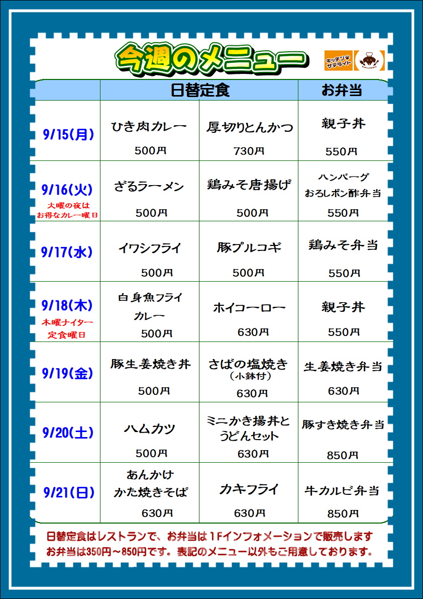 【キッチン・サテライトより】 2025/09/14 9月15日(月)からの日替りメニューです。 おすすめは、9月21日(日)カキフライ定食です。 メニュー表が新しくなりました。 お食事だけでも大歓迎です!お待ちしております。