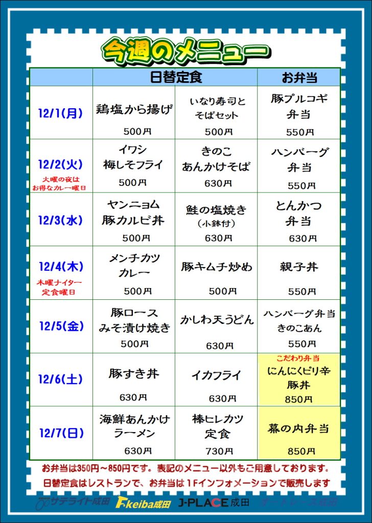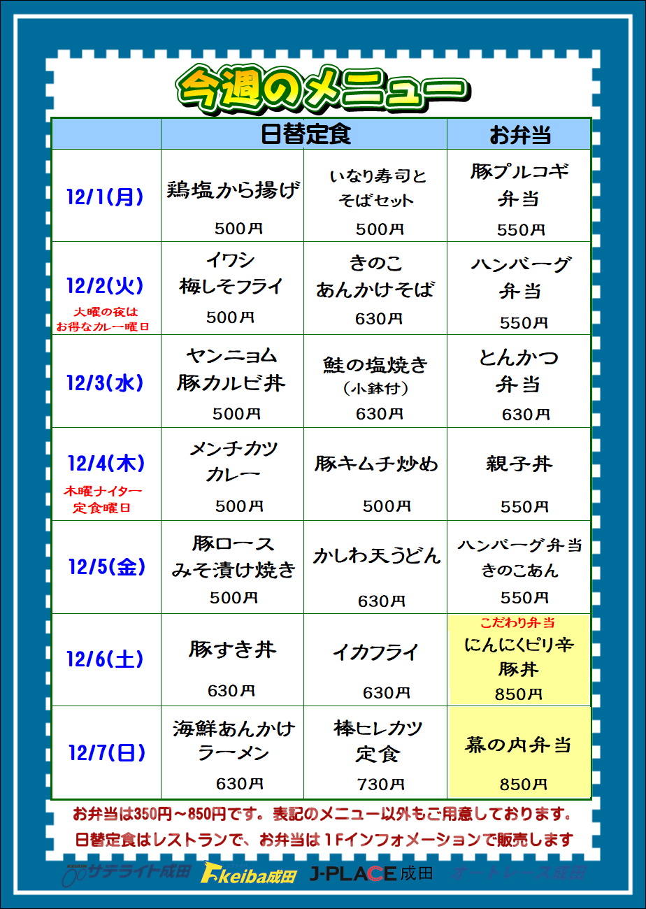 12月1日(月)からの日替りメニューです。