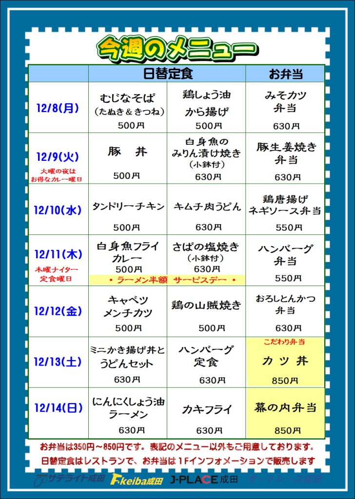 12月8日(月)からの日替りメニューです。