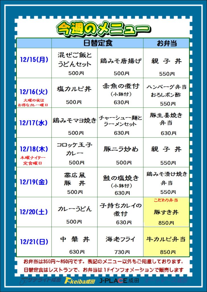 12月15日(月)からの日替りメニューです。
