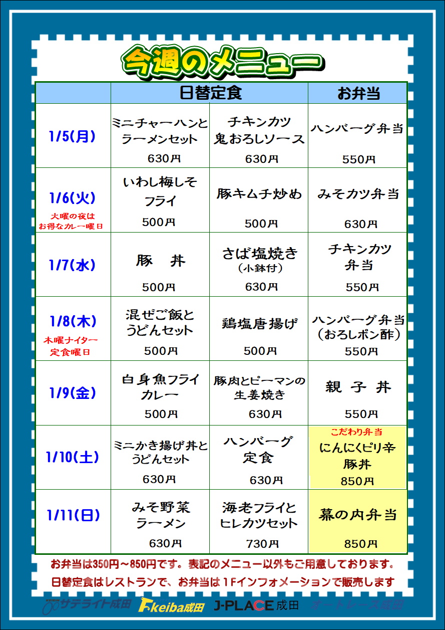 【キッチン・サテライトより】 2026/01/04 🎍 明けましておめでとうございます 🎍 本年もどうぞよろしくお願いいたします。 1月5日(月)からの日替りメニューです。 おすすめは1月11日(日)海老フライとヒレカツ定食です。 お食事だけでも大歓迎です!お待ちしております。
