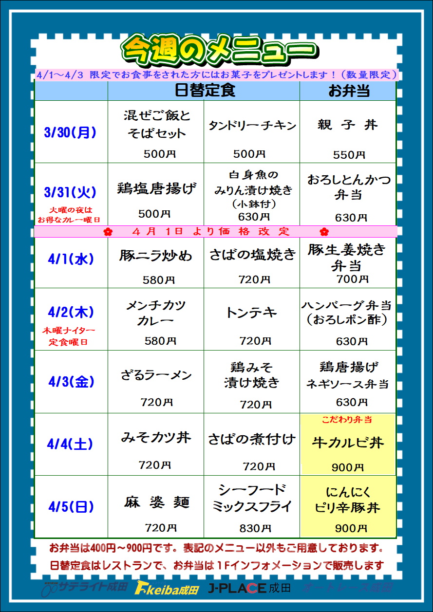 【キッチン・サテライトより】 2026/03/29 3月30日(月)からの日替りメニューです。 4月1日より価格改定いたします。 お客様にはご負担をおかけし、大変申し訳ございません。 これからも、皆様にご満足いただけるよう、 より一層のサービス向上に努めてまいります。 ささやかでございますが、4月1日から3日までの3日間、 お食事を召し上がりいただいたお客様にお菓子を プレゼントいたします。 これからも、どうぞよろしくお願いします。